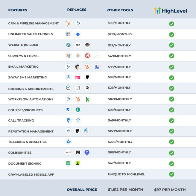 Com nossa plataforma completa de marketing e vendas, você poderá manter suas ferramentas em um só lugar (economizando uma fortuna) e otimizar todo o seu processo de entrega para poder se concentrar em manter seus clientes satisfeitos.